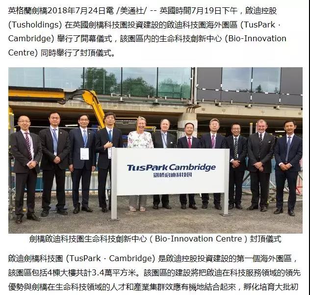 近日,由啟迪控股在英國(guó)劍橋投資建設(shè)的劍橋啟迪科技園(TusPark•Cambridge)舉辦開幕儀式和園區(qū)生命科技創(chuàng)新中心(Bio-InnovationCentre)封頂儀式,該活動(dòng)在全球范圍內(nèi)引起廣泛關(guān)注,位于美國(guó)、法國(guó)、意大利、德國(guó)、英國(guó)、加拿大、瑞士、葡萄牙、俄羅斯、日本、新加坡、韓國(guó)、澳大利亞、印度、泰國(guó)、印度尼西亞、馬來西亞等國(guó)家和中國(guó)香港、澳門、臺(tái)灣地區(qū)的共計(jì)數(shù)百家媒體對(duì)此進(jìn)行了不同形式的報(bào)道。