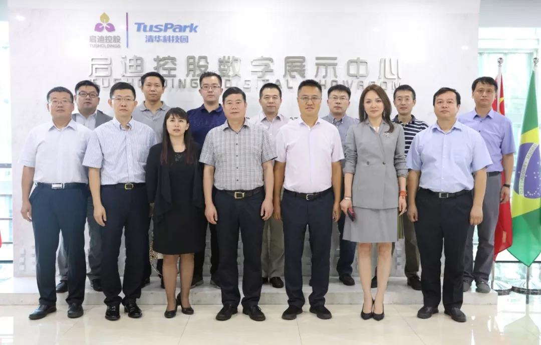 ▲ 薛廷伍總經(jīng)理(前排左四)一行參觀啟迪控股數(shù)字展廳
