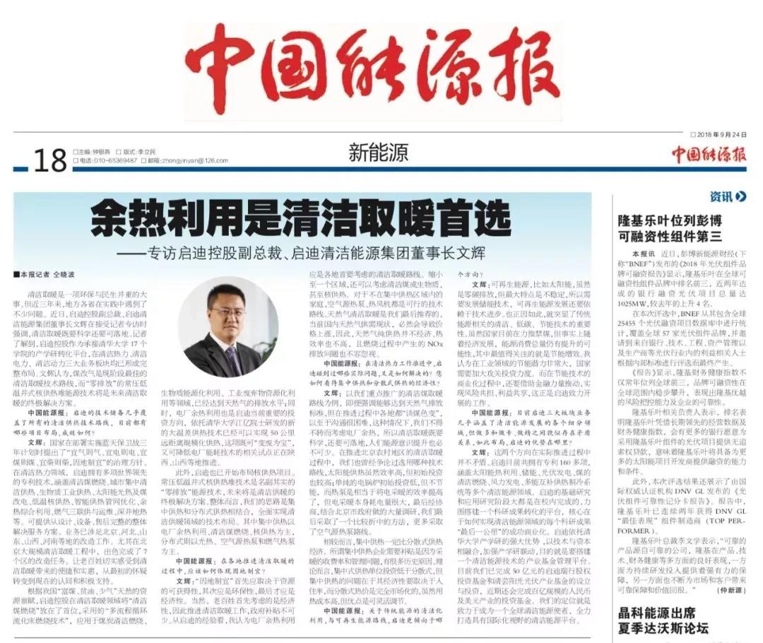 《中國能源報》| 啟迪清潔能源集團:余熱利用是清潔取暖首選